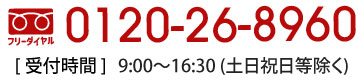 お気軽にお問い合わせください。0120-26-8960受付時間 9:00-16:30